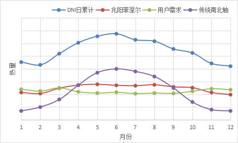 一、针对用热企业冬季用热量明显高于夏季用热量的需求特点,兆阳结合格尔木地区光照情况,采取独有的东西水平轴向阳倾斜布置方案,实现了全年四季得热量基本均衡,冬季得热量远超传统技术路线的目标,能够有效提升镜场全年利用效率,具有显著的实用价值。