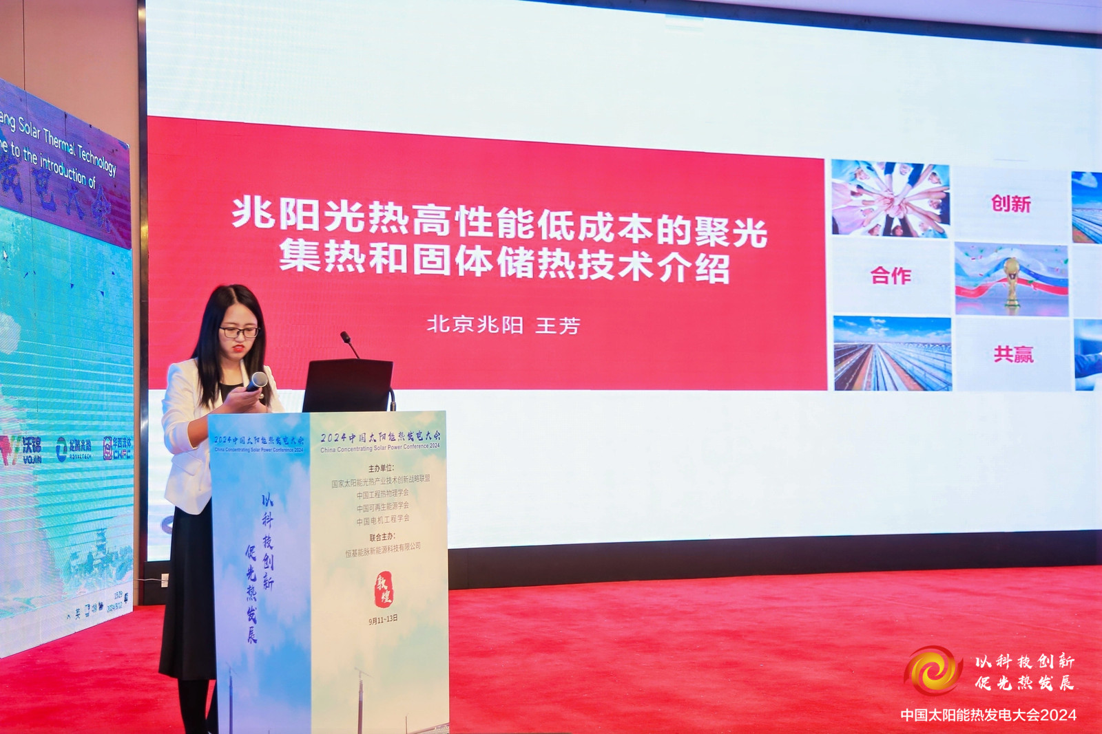大会期间,兆阳光热技术部负责人王芳女士代表公司上台,向与会嘉宾详细介绍了兆阳光热自主研发的聚光集热和固体储热技术。这两项技术不仅代表了兆阳光热在太阳能热利用领域的研究成果,也体现了公司在技术创新方面的不懈追求。