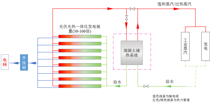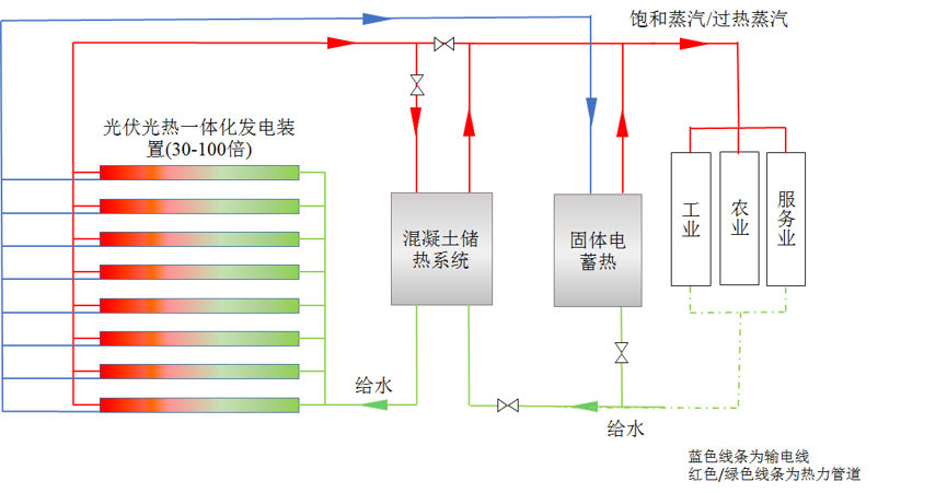 光伏光热一体化发电装置将汇聚的太阳光进行分波段综合高效利用,能够高效输出电能和高温热水。将高温热水储存在混凝土储热装置,需要时,将热量以饱和蒸汽/过热蒸汽形式取出直接利用;将输出的电能转换为热能储存在固体电蓄热装置中,需要时,将热量以饱和蒸汽/过热蒸汽形式取出直接利用。