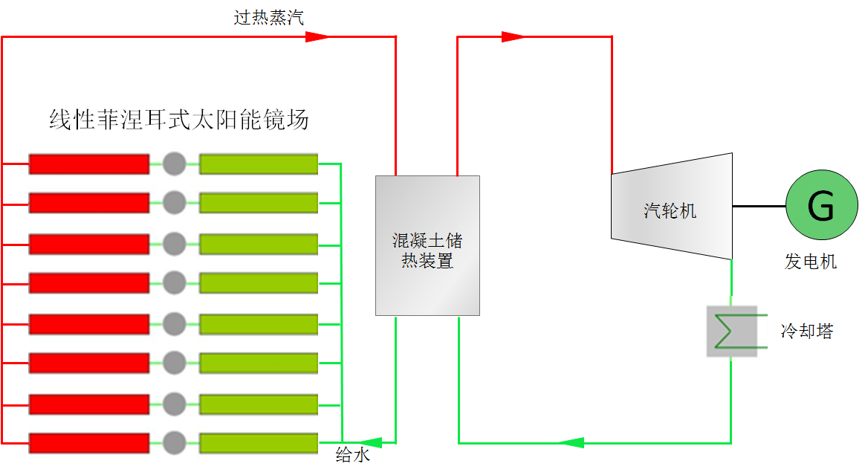 集热储热:通过聚光反射镜将太阳光聚集到吸热器上,水工质吸收热量后形成过热蒸汽,过热蒸汽进入混凝土储热装置中进行热量储存,过热蒸汽冷凝为水后进入到线性菲涅耳式太阳能镜场开始下一轮的循环。