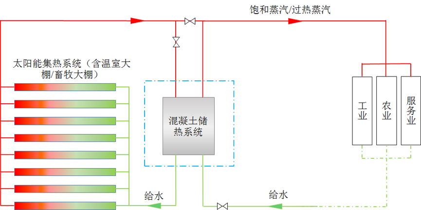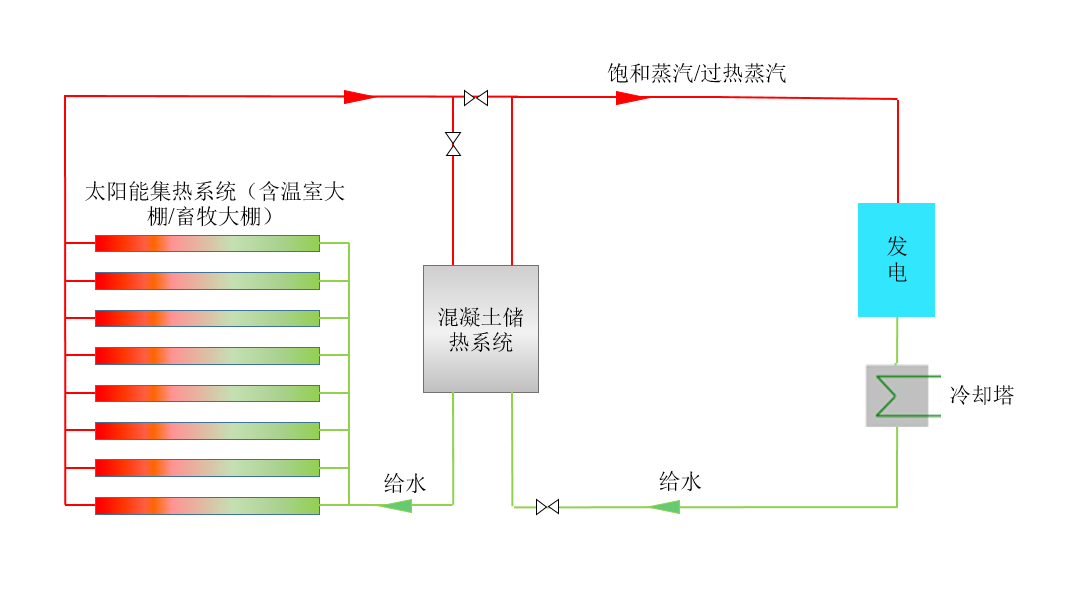 主要包括温室大棚/畜牧大棚、太阳能镜场、混凝土储热装置(可选装)以及换热器(必要时)